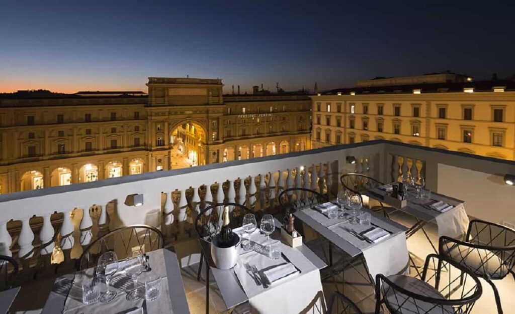 As soon as you set foot on this rooftop you’ll feel like you’re on a movie set. The first word that comes to mind when describing this beautiful location is “elegance”. It is located on the fifth floor of the Grand Hotel Baglioni and apart from the incredible view, you will be able to enjoy some excellent food and wine.